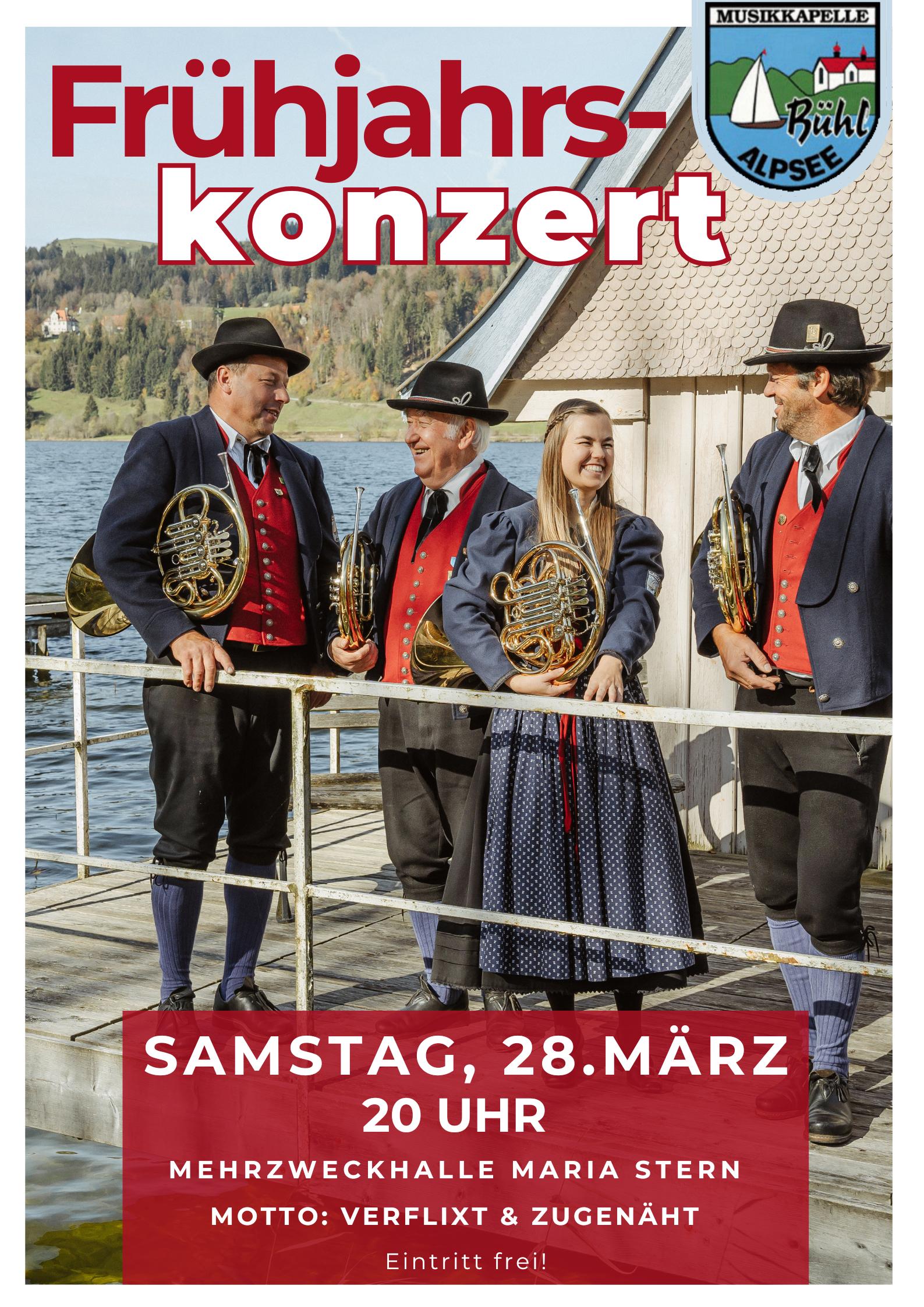 Die Musikkapelle Bühl am Alpsee e.V. mit ihrem Dirigenten Lothar Geist lädt am Samstag, den 28. März 2026 um 20:00 Uhr zum alljährlichen Frühjahrskonzert ein und freut sich über Ihren Besuch. Das Konzert findet in der Turnhalle der Mädchenrealschule Maria Stern in Immenstadt statt und steht heuer unter dem Motto „Verflixt und zugenäht“. Lassen Sie sich überraschen was sich hinter dieser Thematik so alles verbirgt.