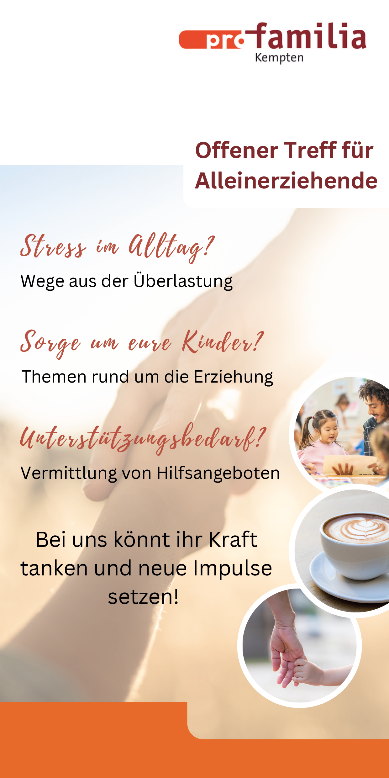 Der Offene Treff für Alleinerziehende ist eine Anlaufstelle für alle Alleinerziehenden in Kempten und Umgebung. Hier finden Alleinerziehende Austausch mit Gleichgesinnten und Ratschläge zu folgenden Themen: